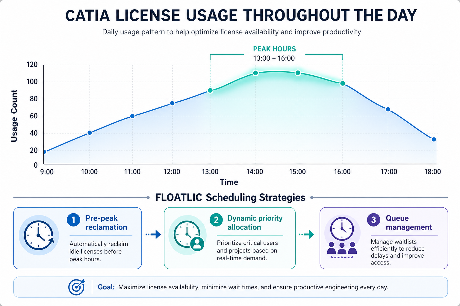 大多数企业 CATIA 短缺集中在两个时段:上午 9:00-10:30 和下午 14:00-16:00。FLOATLIC 可以帮助您在高峰时段自动执行以下操作: