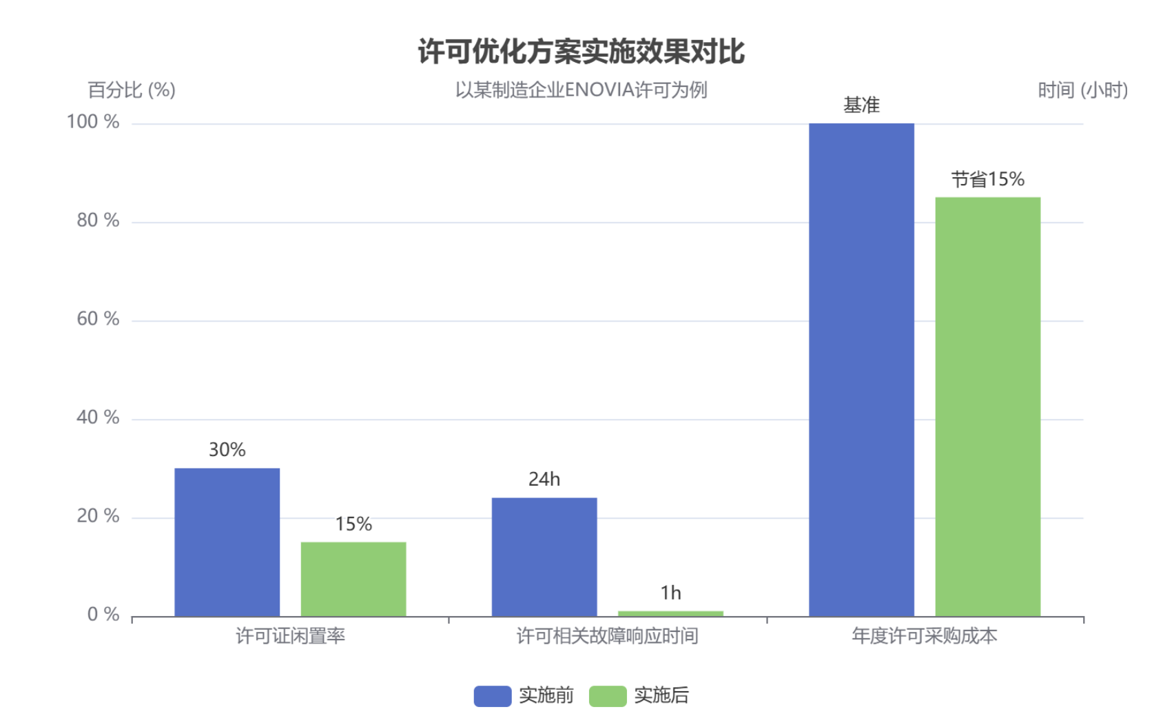 • 成本节约: 利用率的提升直接带来了成本效益。在满足同等研发需求的前提下,企业当年节省了约15%的ENOVIA许可采购预算 。由于能够准确掌握使用高峰和低谷,管理者可以更科学地决定是否增购许可以及增购的时机,避免了不必要的提前采购。对于已有的许可资产,通过优化杜绝了闲置浪费,相当于用更少的钱办了更多的事。在本案例中,企业高层对这一成本节约成果表示认可,认为投入的优化软件费用在短时间内就通过节省的许可开支得到了回报。